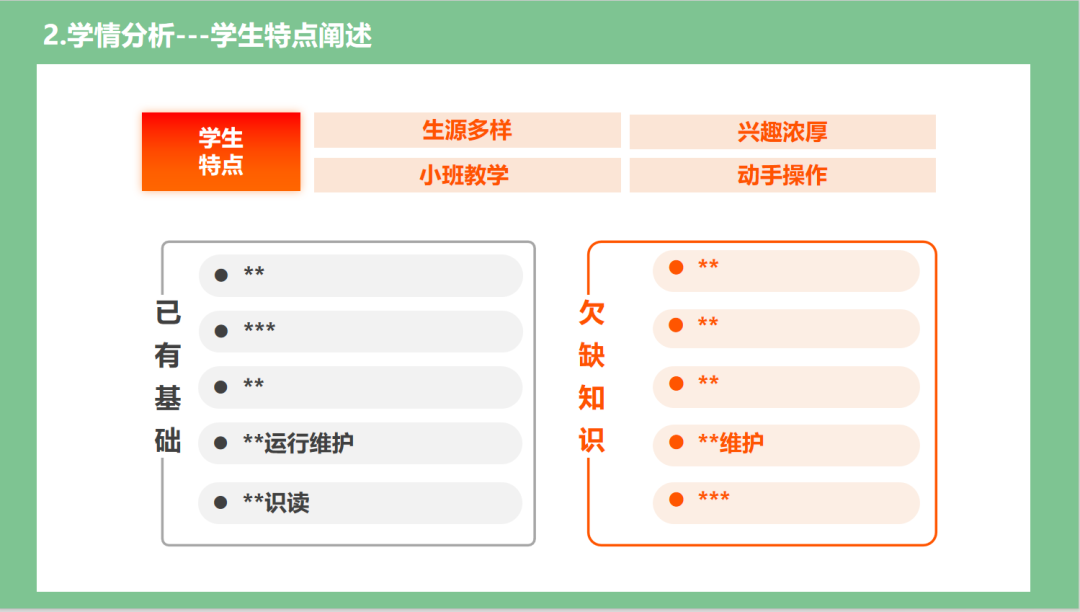 02针对学情分析部分,在撰写教学实施报告时,学生的特点分析是不可或缺的一环。为了深入准确定位学情,我们应当以学生的知识基础、认知能力、学习特点和专业特性为出发点,通过结合文本描述和数据分析,构建一个全面而细致的学情画像。