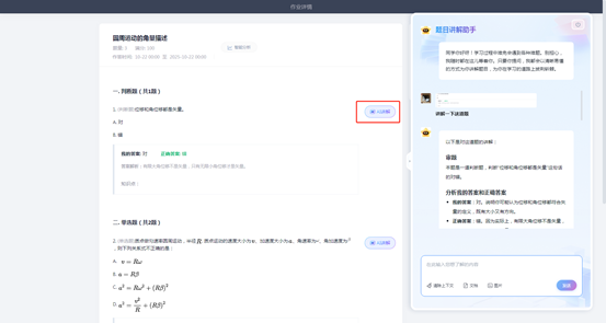 1.发布的作业考试中的题目,学生可通过解题助手智能解析题目要求,提供清晰的解题思路和方法,帮助学生深入理解复杂概念和题目。