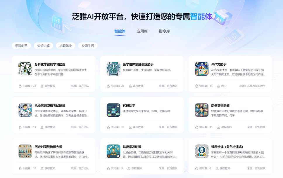 1.系统集成多场景智能体,为多元身份和多样化教学场景提供个性化支持2.支持教师基于自身教学需求,通过自带的低代码平台基于提示工程及任务流搭建专属智能体3.支持教师灵活引入Coze等第三方智能体4.内置快捷指令,只需在工作台输入教学需求,如想使用的教学工具、开展的数学活动等,AI助教就能理解意图并执行操作