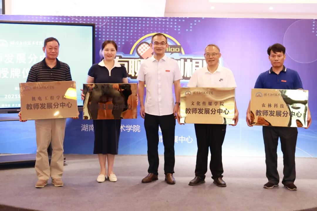 为进一步推动教师专业发展,提升教育教学质量,我校于7月7日在教师发展中心聚志堂隆重举行外国语学院、文化传媒学院、机电工程学院、农林科技学院教师发展分中心授牌仪式。这标志着我校教师发展工作进入高质量发展新阶段,校院两级协同发展的教师培养体系进一步完善。仪式上,湖南应用技术学院校长李旋旗教授、常务副校长李敏教授、教师发展中心主任符赛芬及各相关分中心负责人出席活动,各分中心教师代表共同见证了这一重要时刻。